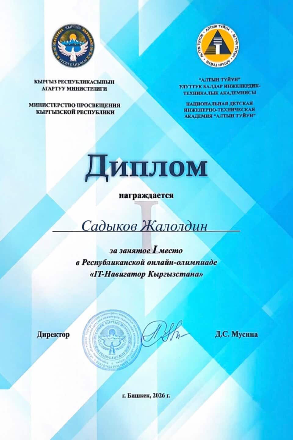 Национальная детская инженерно-техническая академия «Алтын түйүн» провела республиканскую онлайн-олимпиаду «IT-навигатор Кыргызстана», направленную на развитие цифровых компетенций обучающихся, формирование культуры безопасного и ответственного поведения в цифровой среде, а также выявление талантливых школьников.