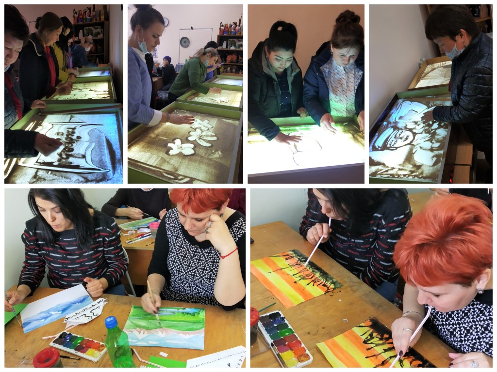 Также на практических занятиях педагоги создавали авторские головные уборы, самостоятельно разрабатывая дизайн; знакомились с пескографией на освещенном столе, придумывали и создавали собственные анимированные проекты: лавстори, сказки и т.п.; учились заполнять сосуды цветным песком, и даже узнали, как рисовать на воде в технике Эбру.