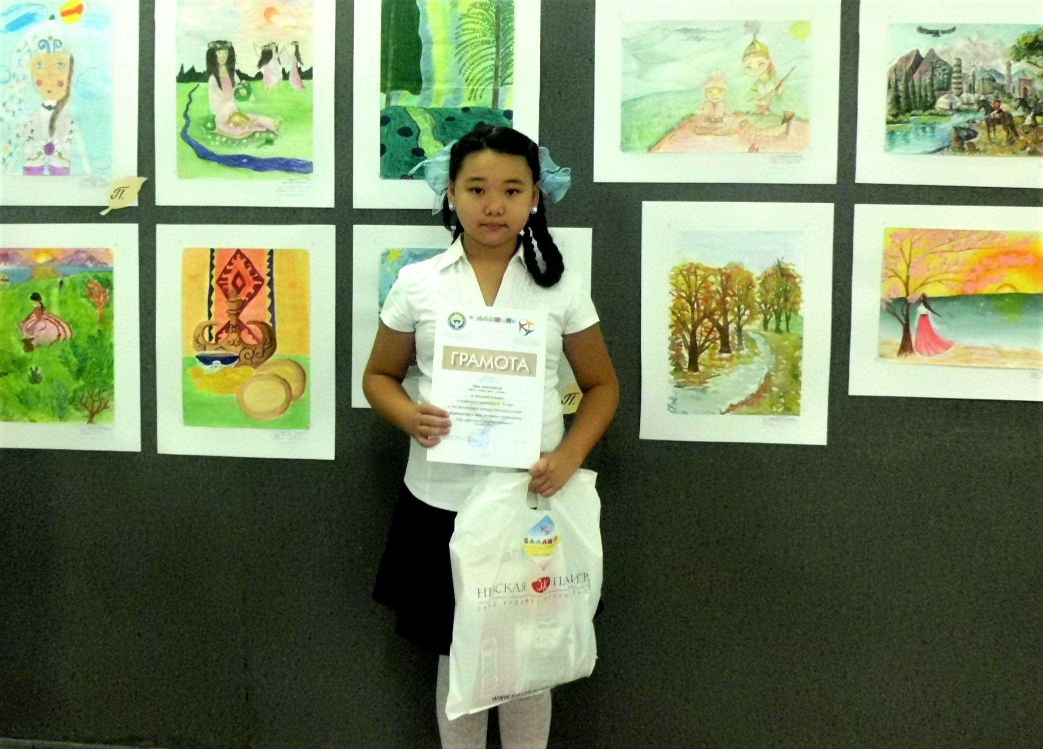 В целях развития творческих способностей, привития любви к Родине, семье и окружающей среде Министерство образования и науки КР и РУМЦЕВ «Балажан» проводили Республиканский конкурс детского рисунка «Кыргызстан в моих рисунках», посвященный Году укрепления государственности. Активное участи приняли в конкурсе воспитанники ИЗО-студий "Солнышко" (руководитель: Солтобаева Д.Ш.) и "Мир сказочных фантазий" (руководитель: Андрющенко В.Ф.) РДИТА "Алтын туйун". "На конкурс прислали более 570 рисунков со всех регионов страны. Жюри под председательством народного художника Кыргызстана Юристанбека Шыгаева рассмотрело каждую работу и определило победителей", - сообщили в "Балажане". Рады отметить, что воспитанница кружка "Солнышко" Нам Настя была награждена Грамотой, поскольку ее работа была признана одной из лучших!