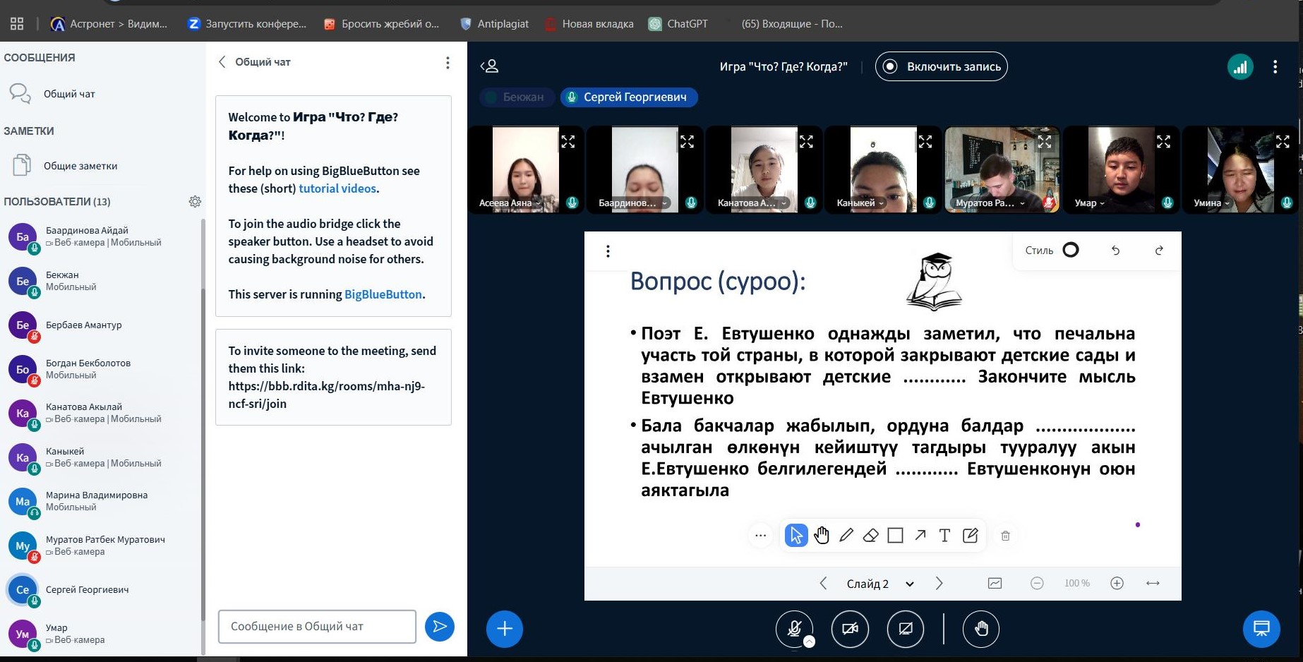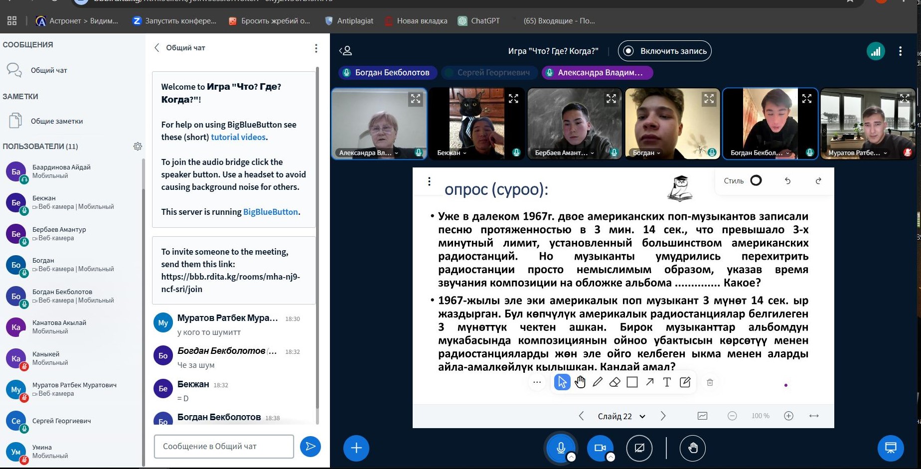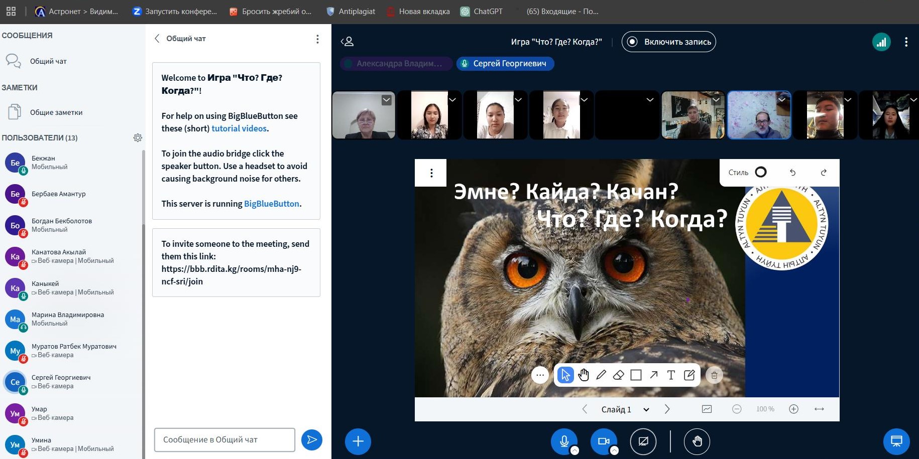 26 декабря начался второй этап онлайн игр "Что? Где? Когда?" для школьников Кыргызстана. Сыграли две команды: "УВК ШГ№ 9" из города Бишкек и "IQ" - из города Чолпон-Ата - учащиеся школы "Билим Ордо". Знатоки сыграли со счетом 6:4 и 4:6.