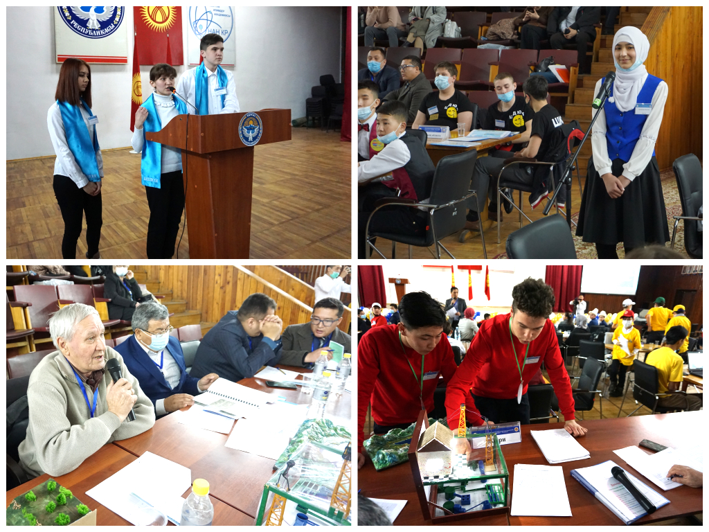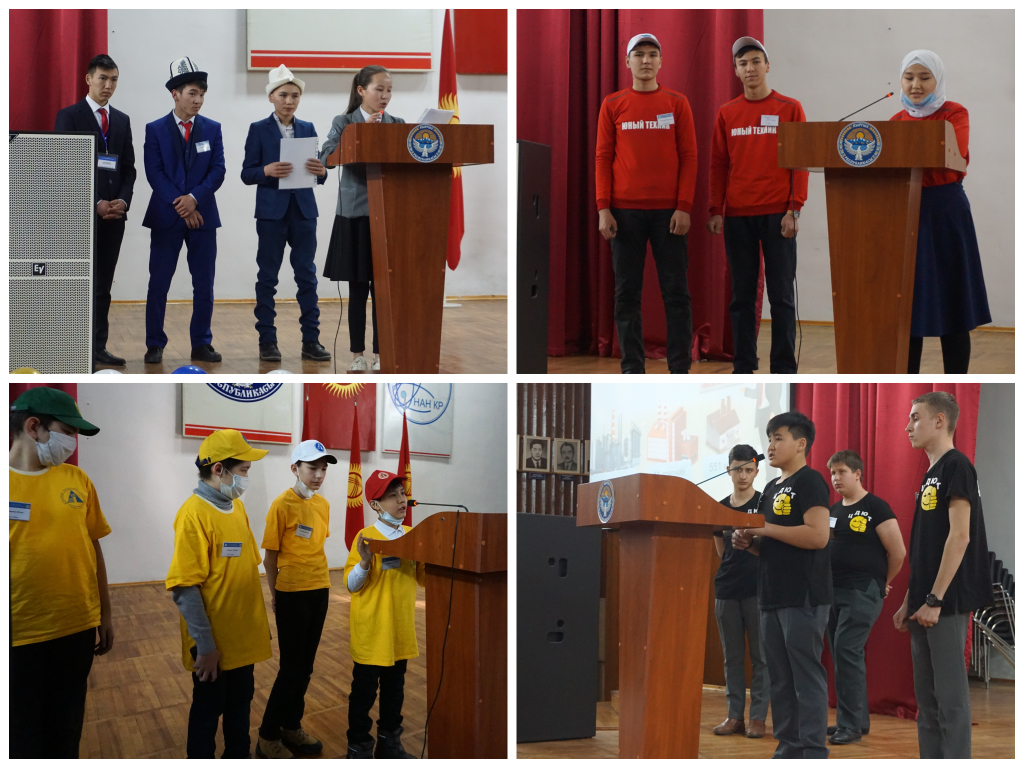 Все три тура оценивало высококвалифицированное жюри, в состав которого вошли видные деятели науки нашей страны: Кожогулов К.Ч. (председатель жюри, член-корреспондент НАН КР, д. т. н., профессор); Шамсутдинов М.М. (профессор, заведующий кафедрой КРСУ им. Б.Ельцина); Баялиев А.Ж. (к. т. н., доцент, зав. кафедрой КГУСТА им. Н. Исанова); Самсалиев А.А. (к. т. н., доцент, зав. кафедрой КГТУ им. И. Раззакова); Степанов С.Г. (изобретатель СССР, зав. лабораторией КРСУ им. Б. Ельцина); Арзыбаев А.М. (к. т. н., доцент, зав. кафедрой КГТУ им. И. Раззакова); Мамытбеков Ж.К. (к. ф.-м. н., председатель совета молодых ученых НАН КР); Шумейко А.В. (ответственный секретарь НТО, Отличник образования КР). Члены жюри и организаторы НТО были впечатлены тем, как широко и творчески мыслят ребята, какие научные вершины стараются покорить в своих проектах! В своих исследовательских разработках они предлагали инновационные решения для городов и сел, в которых живут, рассказывали о строительстве теплиц, заводов, производственных предприятий – сколько патриотизма было в их словах и идеях!