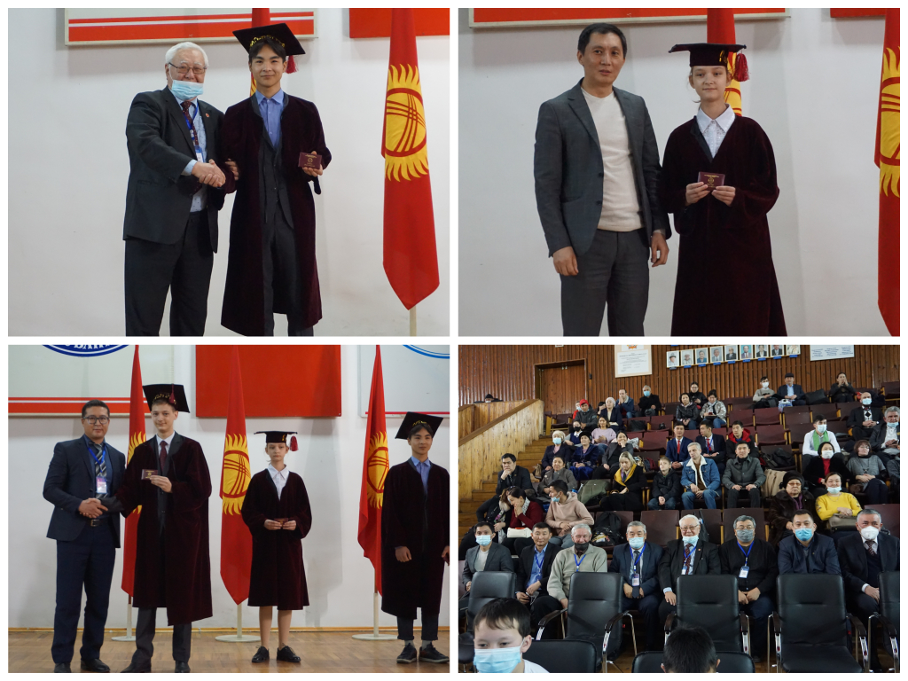 Мантию и свидетельство ребятам вручали доктор технических наук, член-корреспондент НАН КР Бримкулов Улан Нургазиевич, доктор педагогических наук, профессор, вице-президент КАО Мамбетакунов Улан Эсенбекович и кандидат физико-математических наук, председатель совета молодых ученых Национальной Академии Наук Мамытбеков Жайлоо Кыдырович.